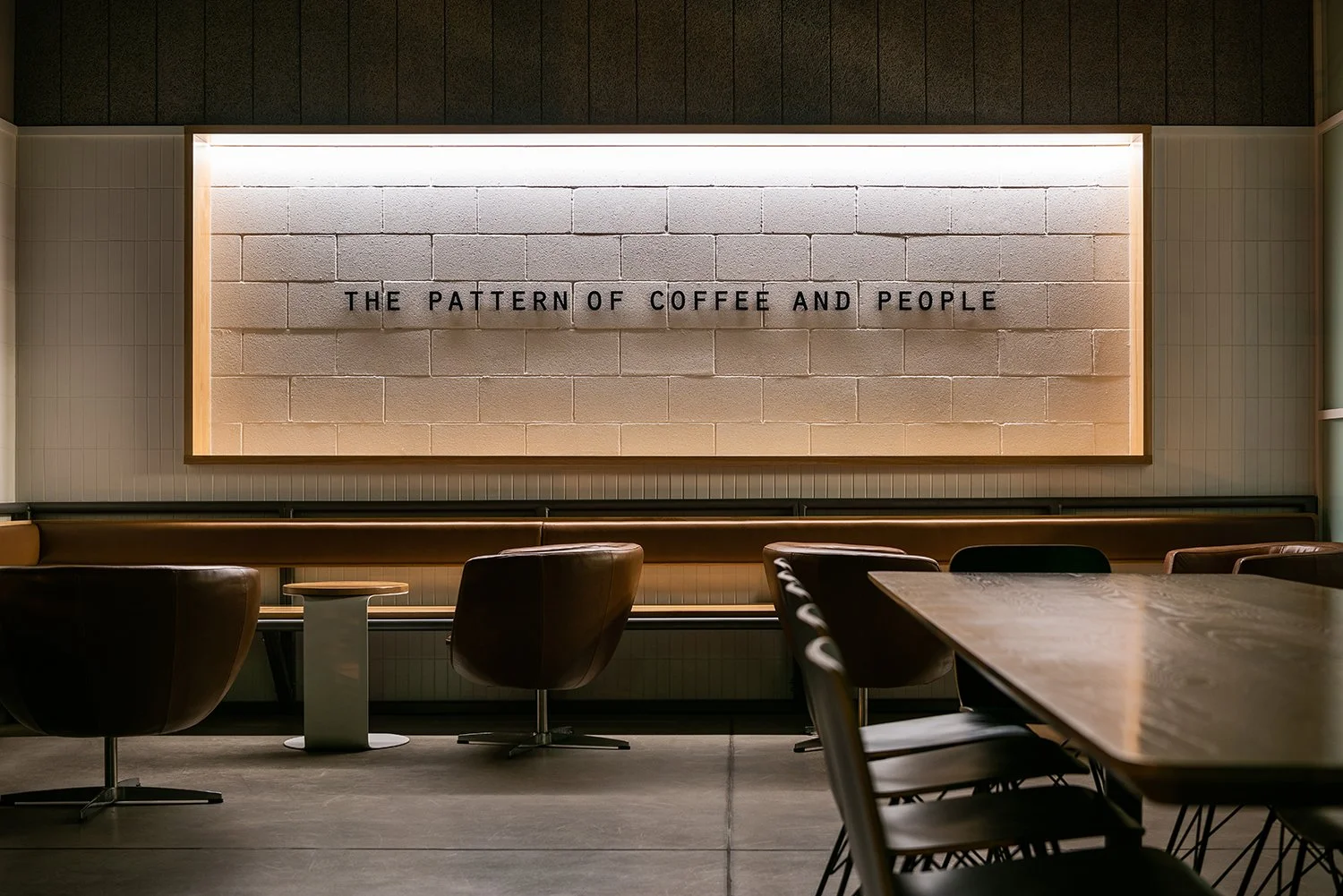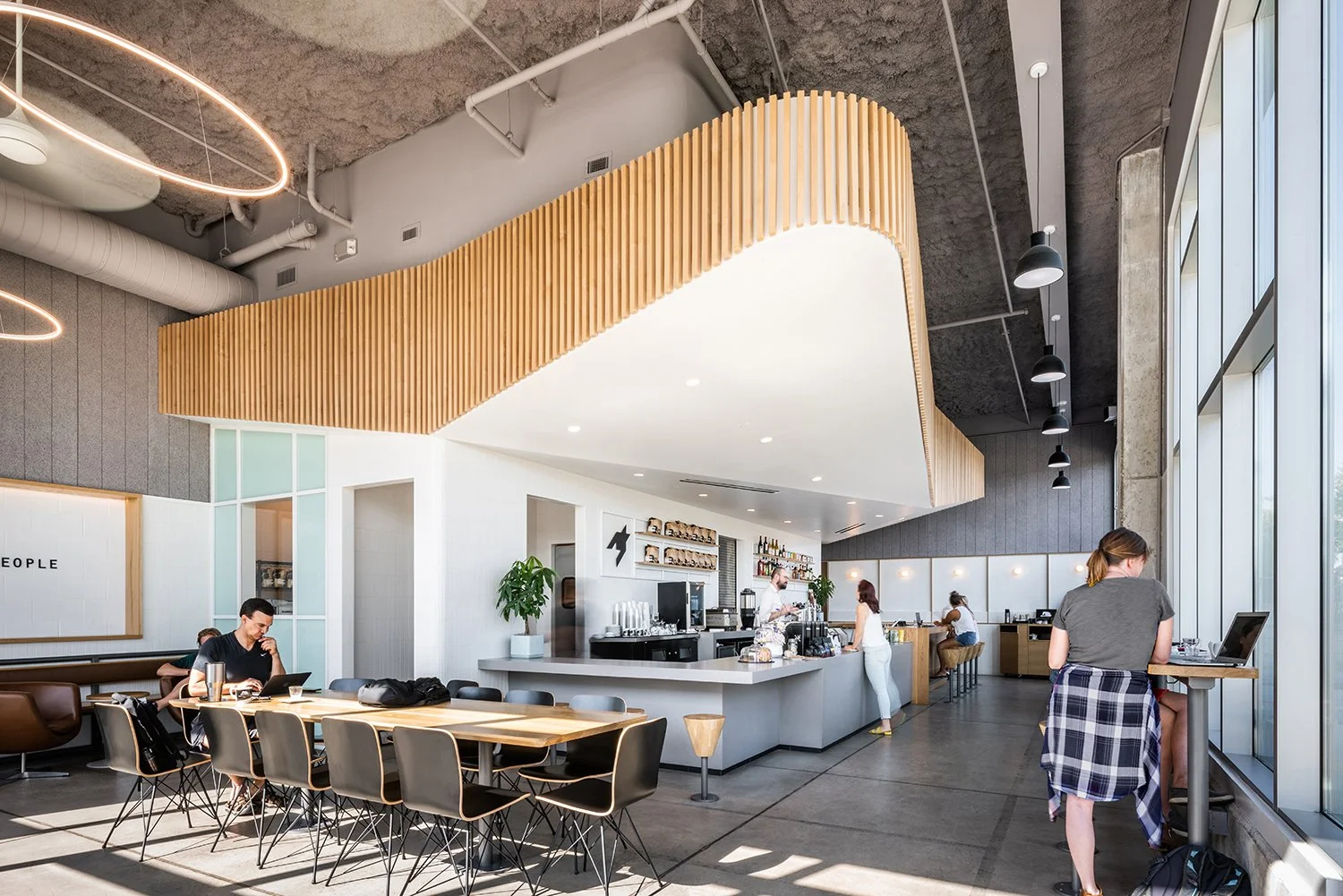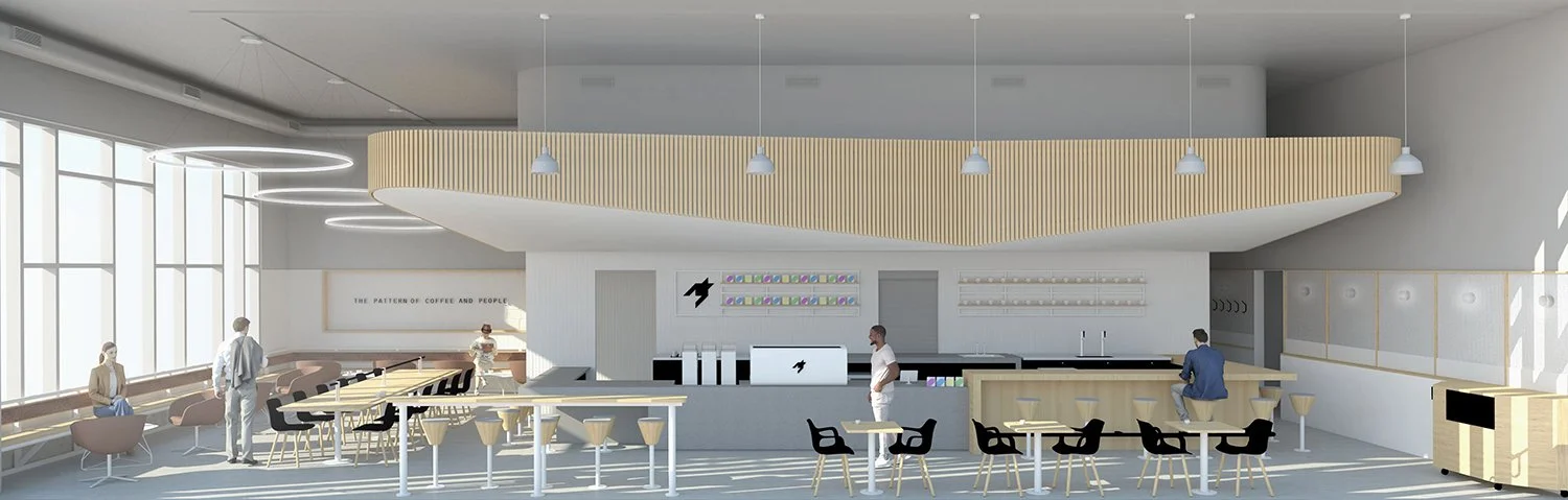 Houndstooth Coffee features a bright, welcoming interior with a U-shaped bar conceived as a sculpted form inspired by a ship in a bottle. The space incorporates materials such as quartz, white oak, and alder, creating a clear path from entry to service, with mechanical systems concealed within the angular ceiling above the bar. All fixed furniture, including seating and bar components, are custom designed by OFFICIAL.