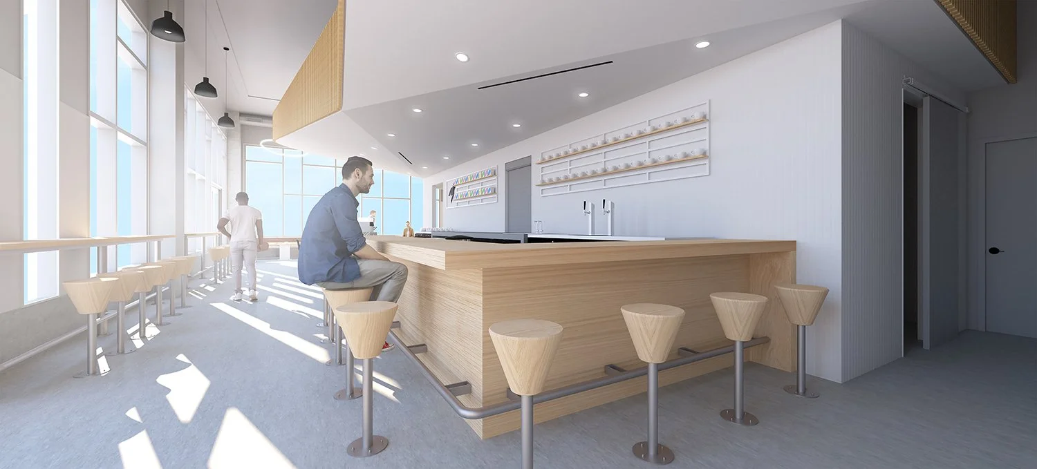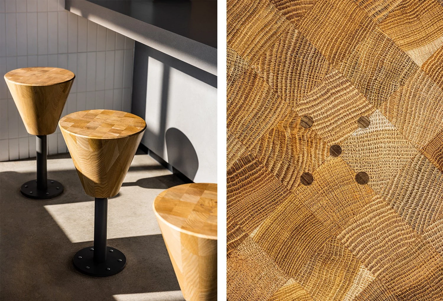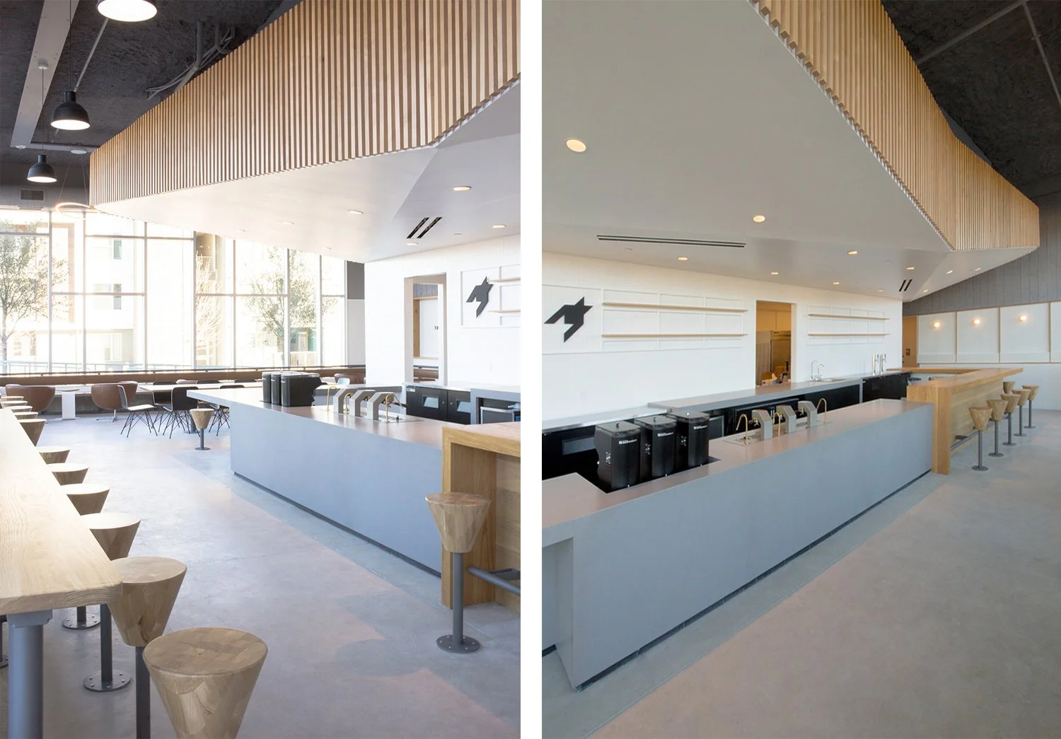 Houndstooth Coffee features a bright, welcoming interior with a U-shaped bar conceived as a sculpted form inspired by a ship in a bottle. The space incorporates materials such as quartz, white oak, and alder, creating a clear path from entry to service, with mechanical systems concealed within the angular ceiling above the bar. All fixed furniture, including seating and bar components, are custom designed by OFFICIAL.