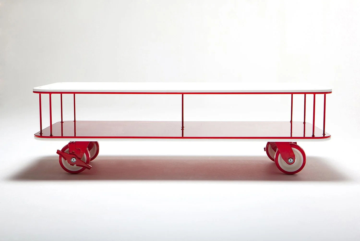 Racer is a coffee table inspired by the soapbox derby car, designed to be mobile while serving as a centerpiece for modern living rooms, where it functions as a storage space and area for eating and playing games. Its heavy-duty casters with locking brakes allow for easy rearrangement, while the high gloss aluminum powdercoat gives it a new toy shine.