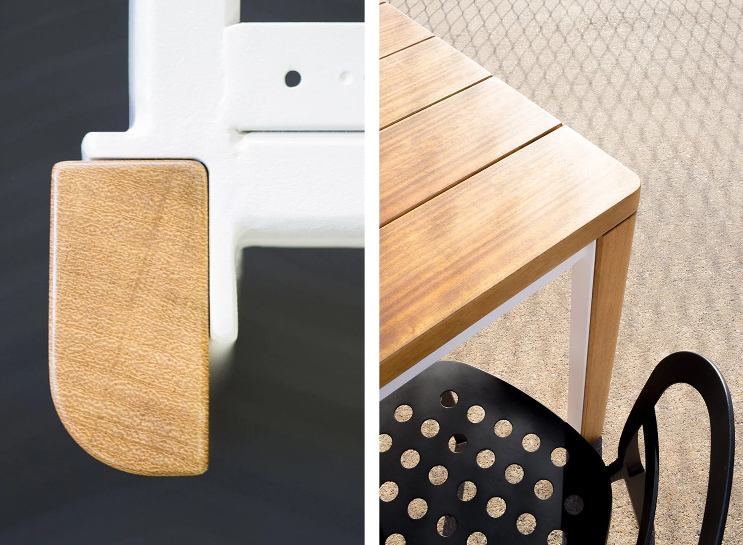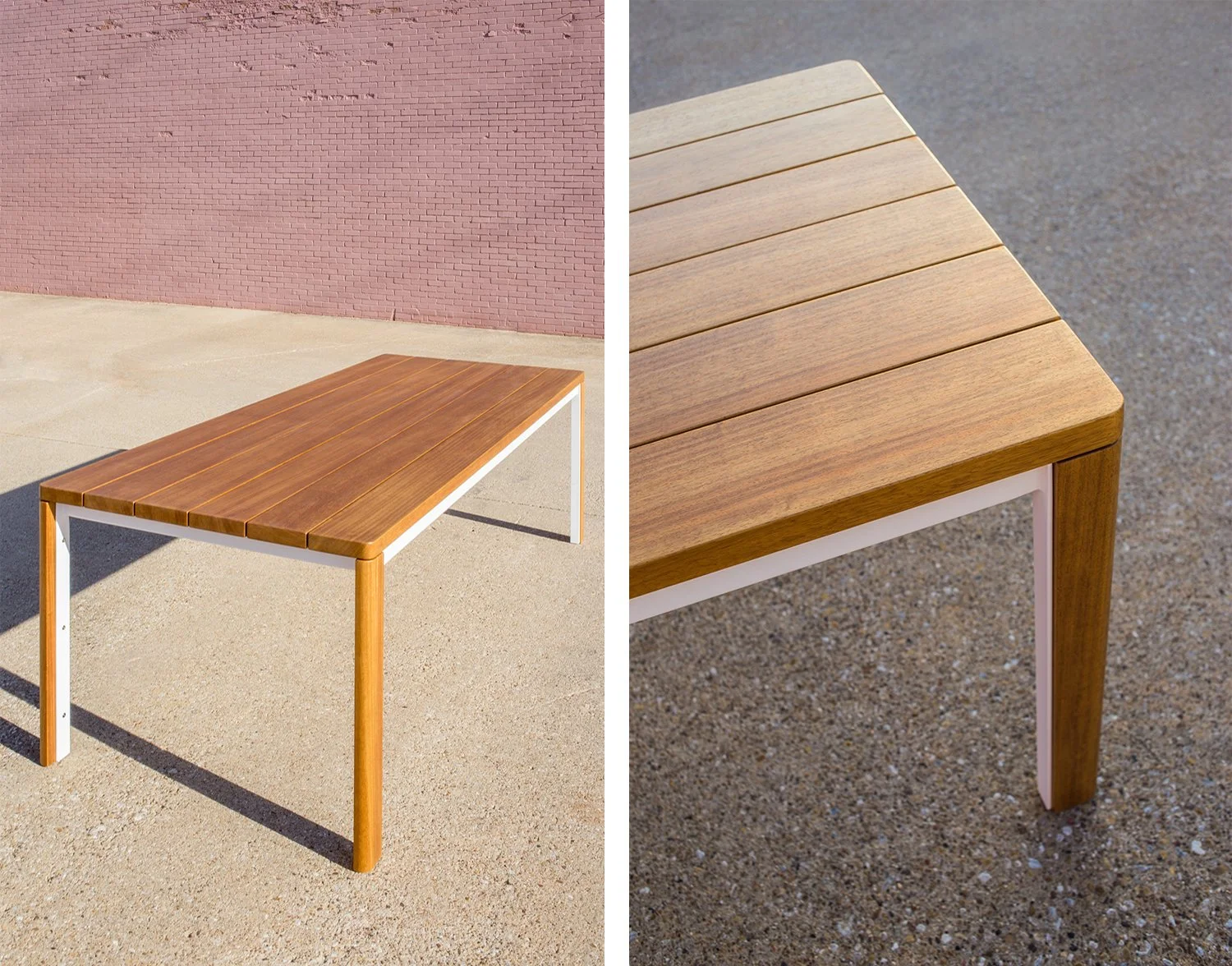 An exterior grade table with a white textured powder coated steel frame and teak boards.
